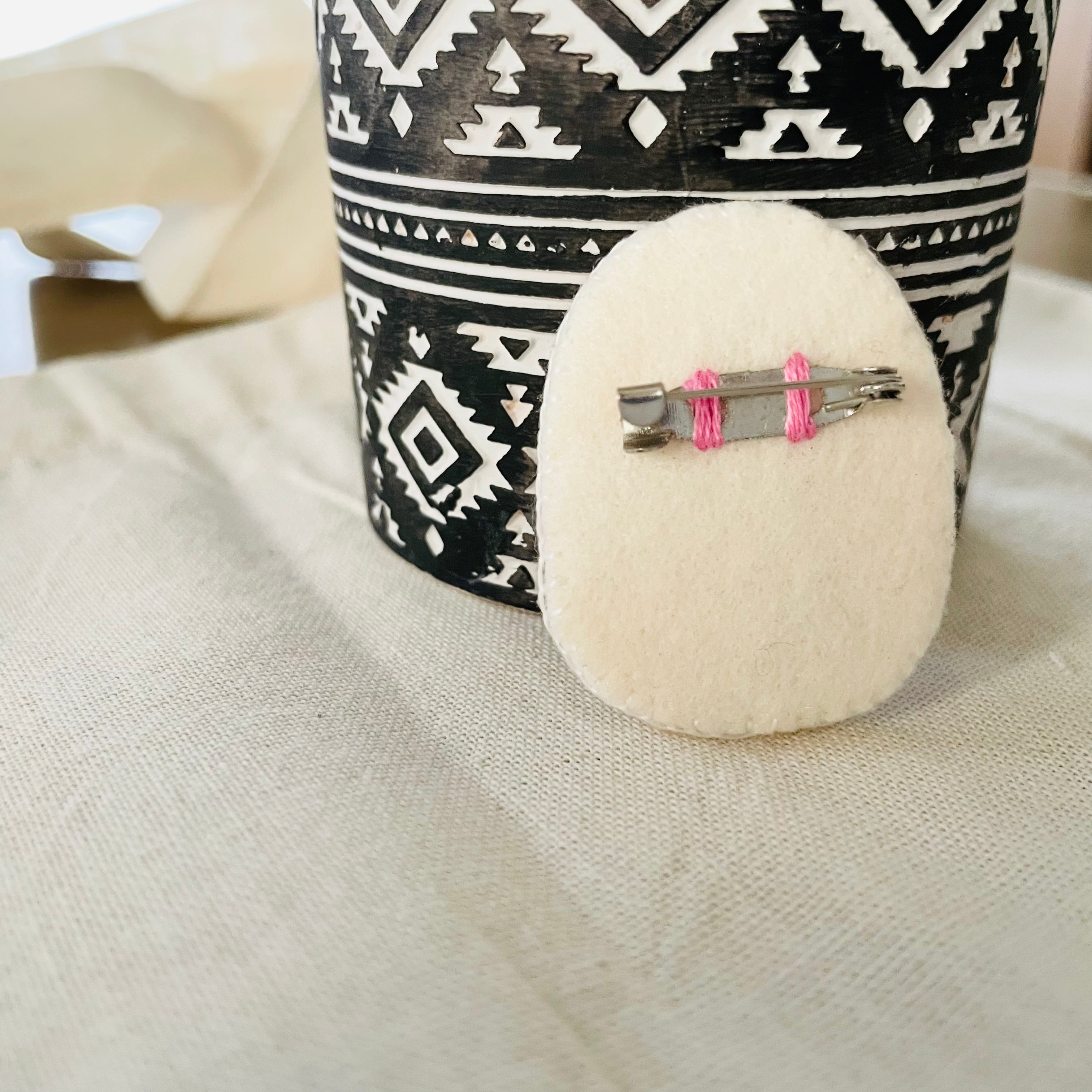 ブローチ部分はお子様は特にお気をつけください。刺繍糸の特性上、縮み、色落ち等の問題は避けられません。