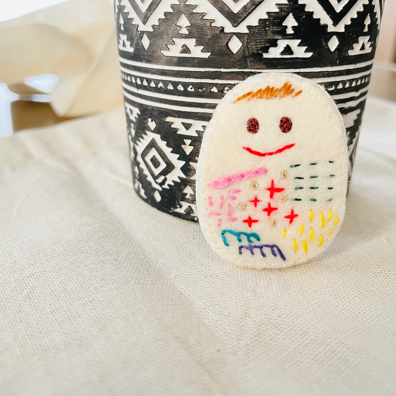 フェルトに色とりどりの刺繍が施されています。手触り柔らかです。